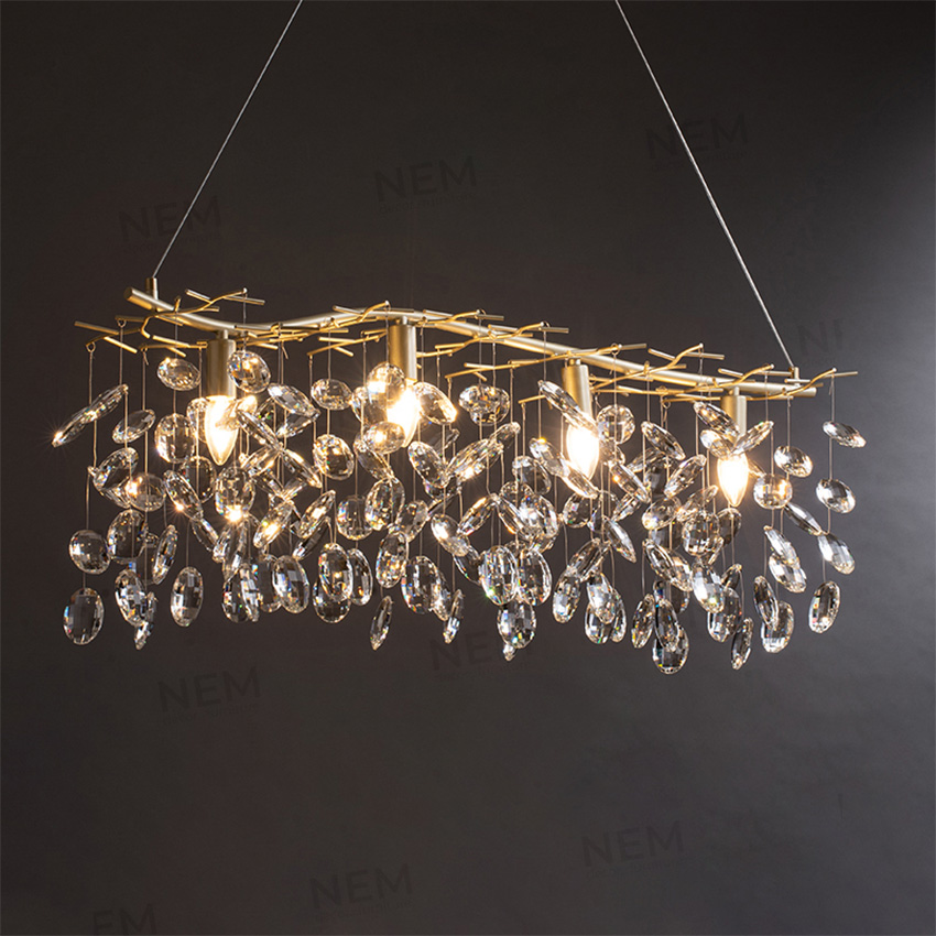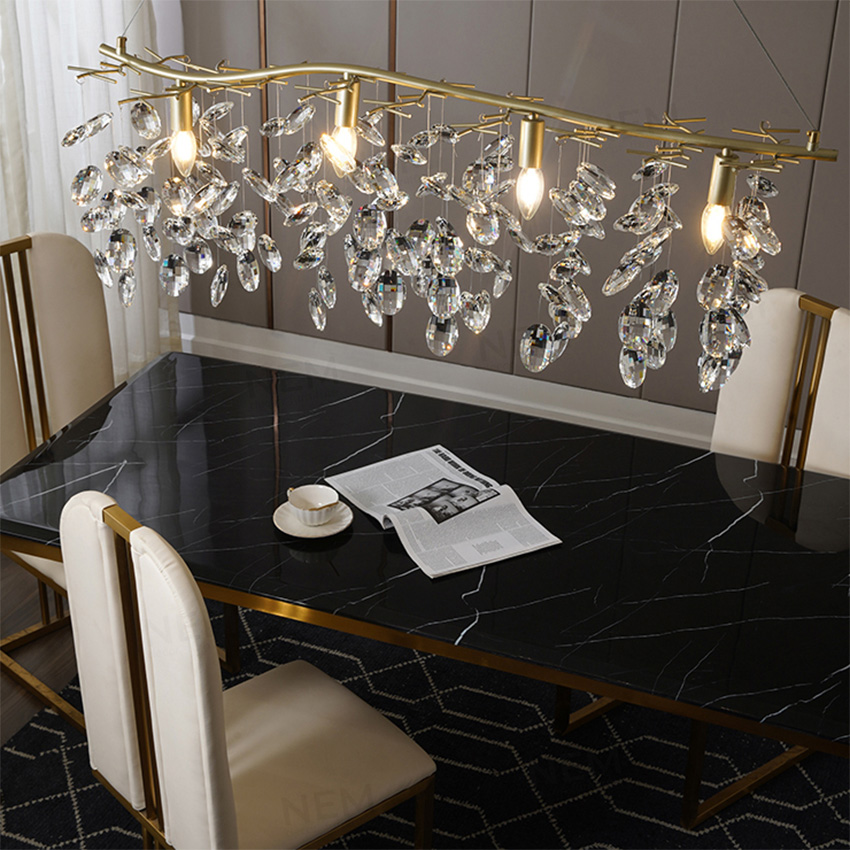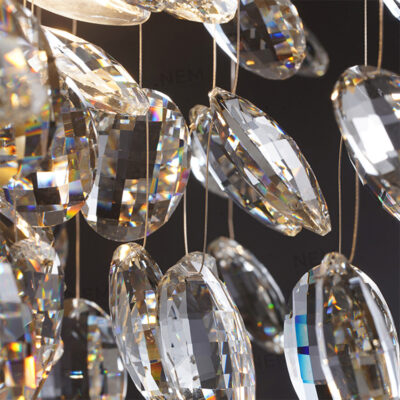 - Pha lê K9 là điểm nhấn khi được chế tác thành những cánh hoa rũ xuống, tạo hiệu ứng ánh sáng lung linh cho không gian.